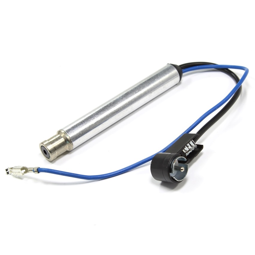 Преход за свързване на стандартно радио към активна автомобилна антена с вграден усилвател на AUDI VW и други след 1997 година. Синия кабел е стандартно захранване при включено радио +12V при всички универсални радио конектори. През него се подава захранване към усилвателя на антената.