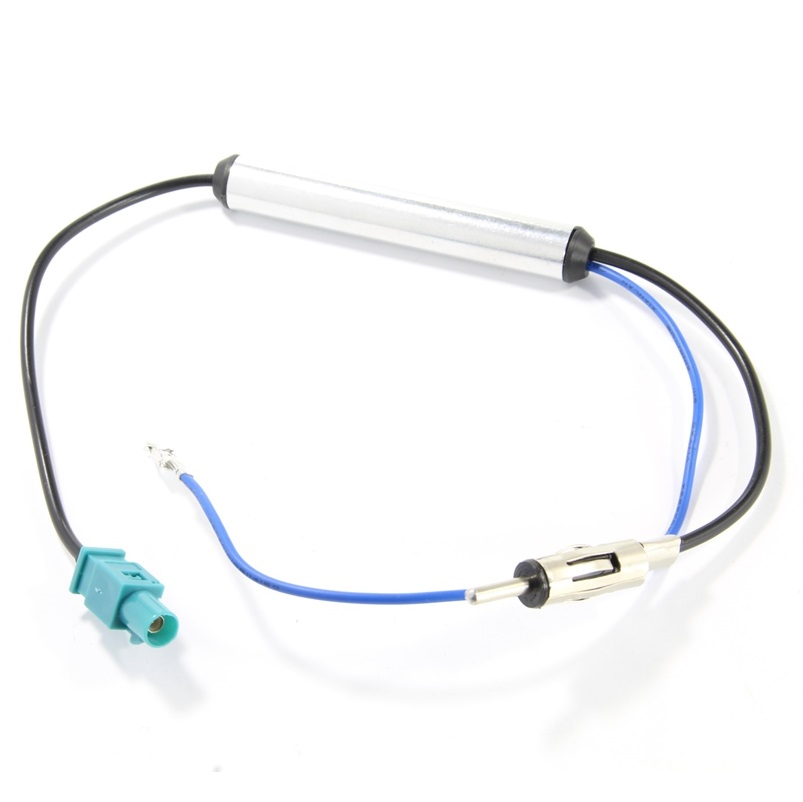 Преход за свързване на стандартно радио към активна автомобилна антена която се захранва по кабела.Синия кабел е стандартно захранване при включено радио +12V при всички универсални радио конектори. През него се подава захранване към усилвателя на антената.