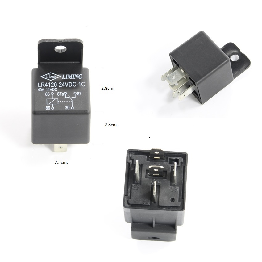 Реле с пет клеми,нормално отворен и затворент контакт. Управляваща бобина 24V DC. Товар на силовите контакти при 14V DC =40A MAX