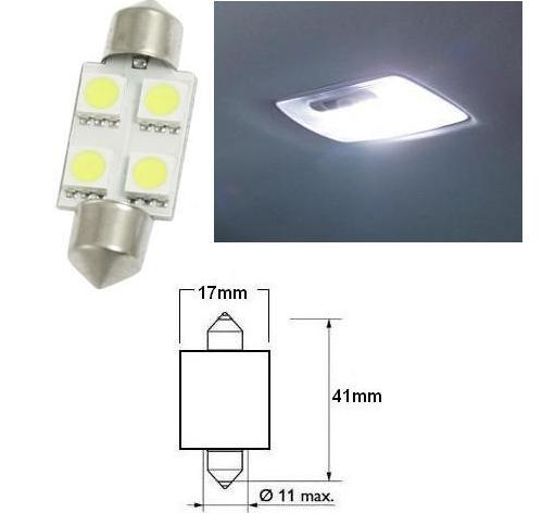 Светодиодна крушка за автомобил с 4 ярко-светещи бели светодиода. Заместител на C5W/C10W/SV8.5/41mm. За плафони или номера. 12V