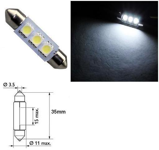 Светодиодна крушка за автомобил с 3 ярко-светещи бели светодиода. Заместител на C5W/C10W/SV8.5/36mm. За плафони или номера. 12V