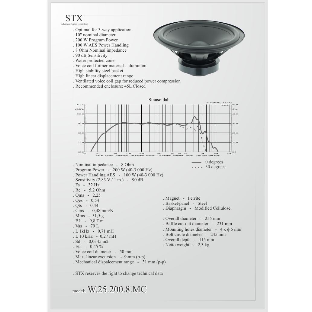 Ниско честотен говорител,произведен от STX Полша. Размер 10"-25cm. Мощност 100W 8ohm. 40-3000 Hz. Бобина 2". Монтажен отвор 23.1cm.