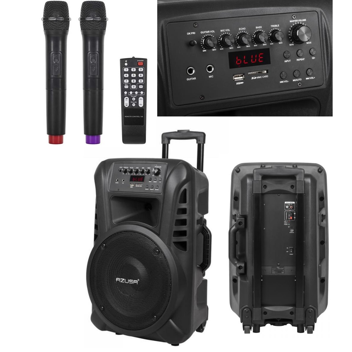 Преносима тонколона с качествен усилвател,акумулатор,два безжични микрофона с честота над 200MHz с перфектна чувствителност,дистанционно управление. Bluetooth/MP3/SD/USB/FM радио. Зарядно от 220V AC и конектор за допълнително захранване от 12V DC. Динамичен високочестотен говорител 1". Широколентов нискочестотен говорител 12"/30cm. Перфектен звук и качество.