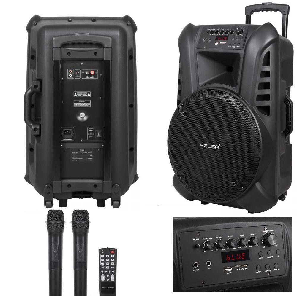 Преносима тонколона с качествен усилвател,акумулатор 12V 7AH,два безжични микрофона с честота над 200MHz с перфектна чувствителност,дистанционно управление. Bluetooth/MP3/SD/USB/FM радио. Захранване от 220V AC и конектор за допълнително захранване от 12V DC. Динамичен високочестотен говорител 1". Широколентов нискочестотен говорител 15"/38cm. Перфектен звук и качество. Реална мощност 60W. 21.5kg.