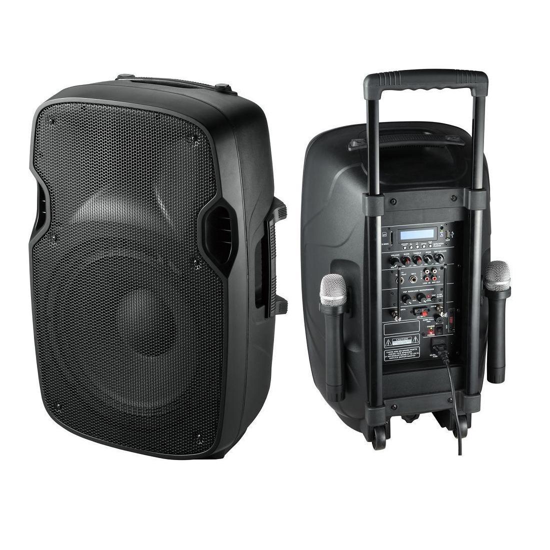 Тонколона с усилвател,акумулатор 12V 7A, два микрофона и дистанционно управление. Bluetooth/MP3/SD/USB/FM радио. Заряд от 220V AC и 12V DC. Високочестотен говорител 1.5". Нискочестотен говорител 12"/30cm. Реална мощност 30W.