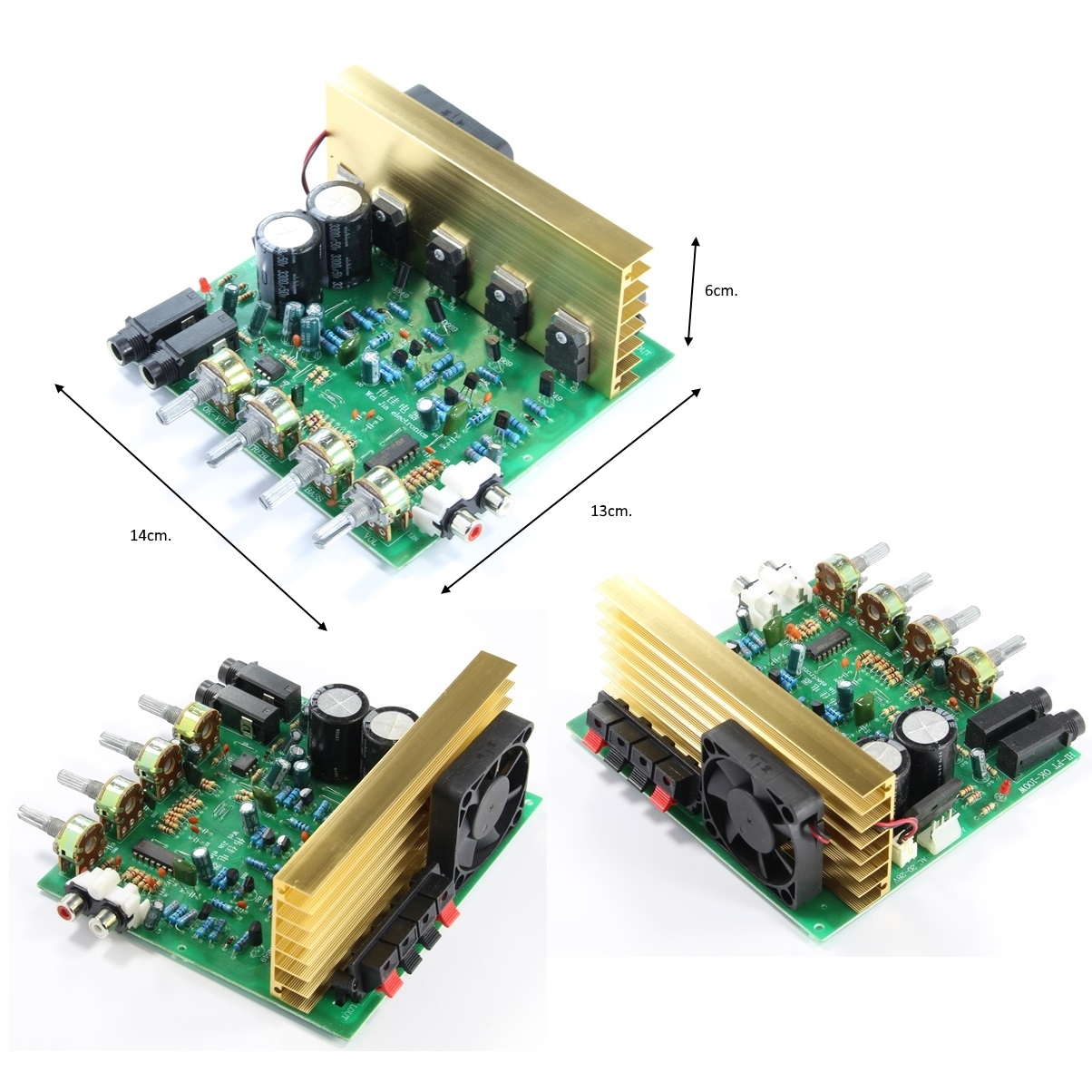 Четири крайни транзистора 2SD718/2SB688 с алуминиев радиатор и вентилатор.