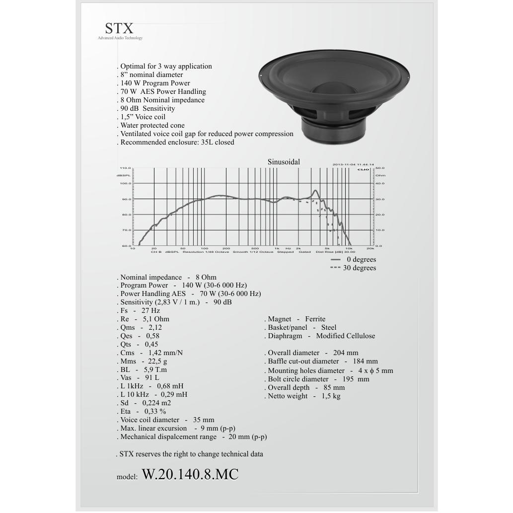 Ниско честотен говорител,произведен от STX Полша. Размер 8" 20cm. Мощност 70W 8ohm. 30-6000 Hz. Бобина 1.38". Монтажен отвор 18.4cm.