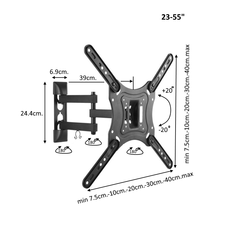 Движение на ляво и дясно до 90градуса.Плътно прибиране към стената.Наклон напред -+20° / -20°