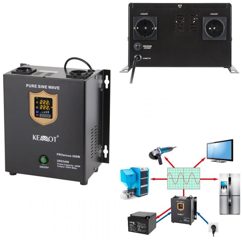 Резервно захранване с чиста синусоида за автоматични парни котли,камини и пелетни горелки,локални отоплителни системи,компютърни системи и други устройства които имат нужда от захранване при липса на ток от мрежата. Напълно автоматични режими на заряд и превключване при спиране на тока и обратно. Интелигентен заряд за акумулатора 12V с оптимален капацитет 100/120A и максимален ток на заряд до 10A. Устройството може да се използва отделно като инвертор/преобразувател от 12V/220V AC , като стабилизатор за 220V AC също и като зарядно за акумулатори с изходен ток на заряд до 10A. Изходна мощност за 220V AC/300W MAX. Чиста синусоида на изходното напрежение 220V AC. Подходящо за индукционни термо помпи, електрически двигатели и уреди с максимална консумация до 300W/220V AC. Светодиодна индикация за входящо изходящо напрежение,индикатор на заряда и акумулатора,диаграма на степента на натоварване.