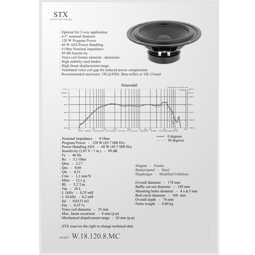 Ниско честотен говорител,произведен от STX Полша. Размер 6.5" 17cm. Мощност 60W 8ohm. 45-7000 Hz. Бобина 1". Монтажен отвор 14.9cm.