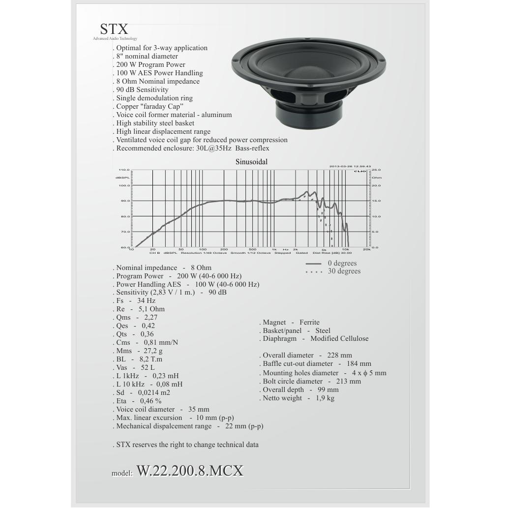 Ниско честотен говорител,произведен от STX Полша. Размер 8" 22cm. Характеристики 100W RMS 8ohm. 40-6 000Hz. Бобина 1.38". Монтажен отвор 14.9cm.