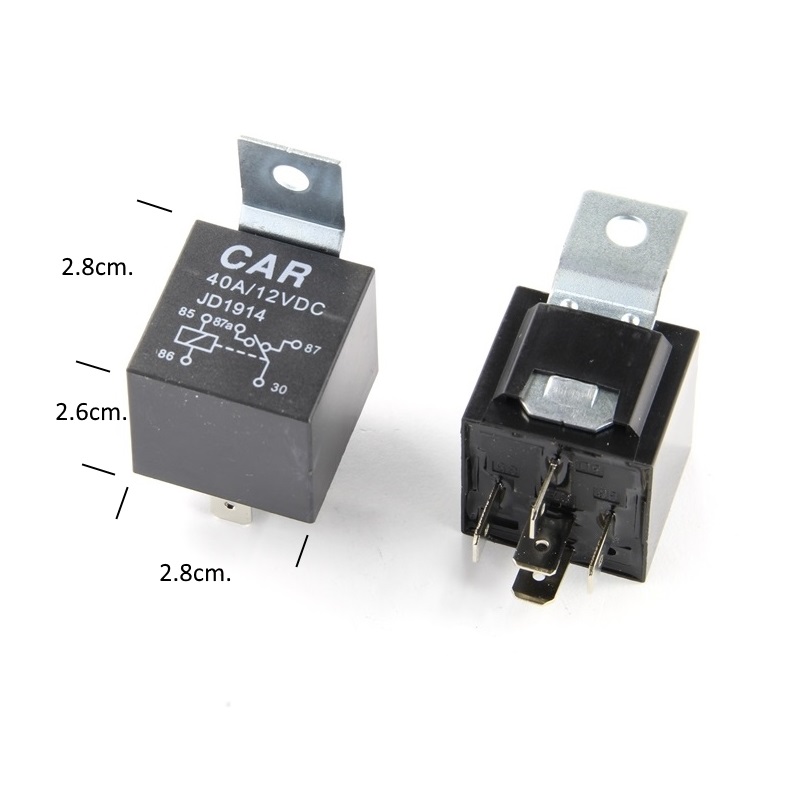 Реле с пет клеми,нормално отворен и затворент контакт. Управляваща бобина 12V DC. Товар на силовите контакти при 14V DC =40A MAX