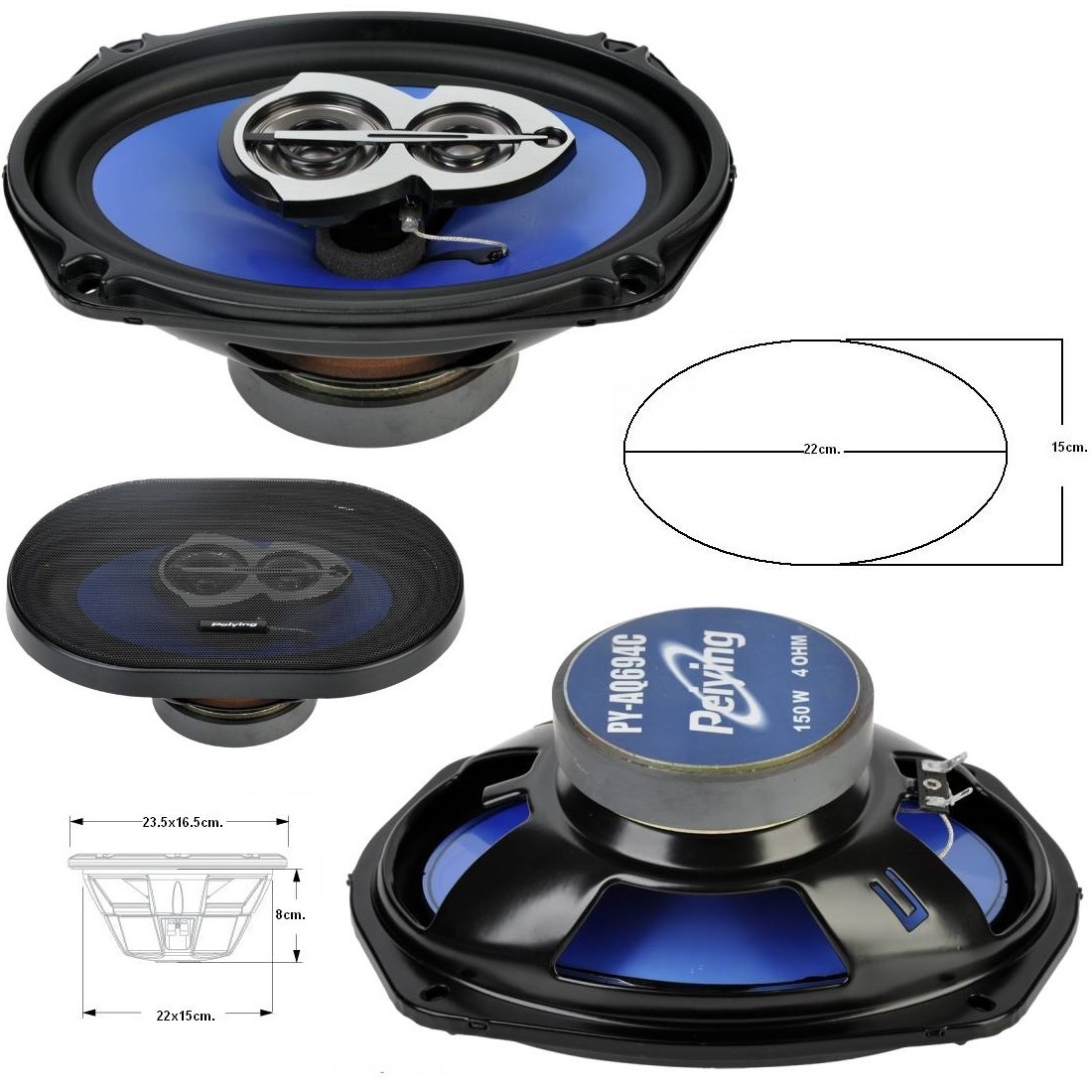 Автомобилни говорители четири-лентови 6x9"-150x230mm. 4ohm. 45-20 000 Hz-90dB. 150W MAX. Диаметър на отвора за монтаж 15x22cm. Дълбочина за монтаж 8cm.
